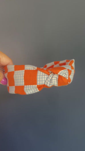 Topknot headband made using Checkmate Checkers in Phoenix double cloth fabric designed by Fableism.