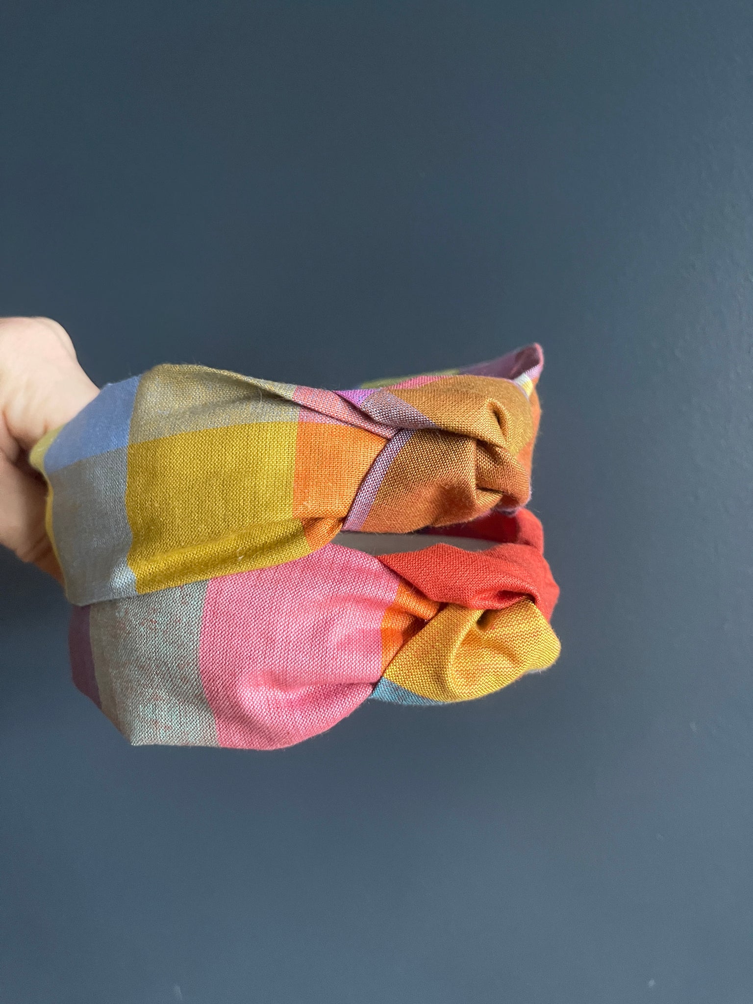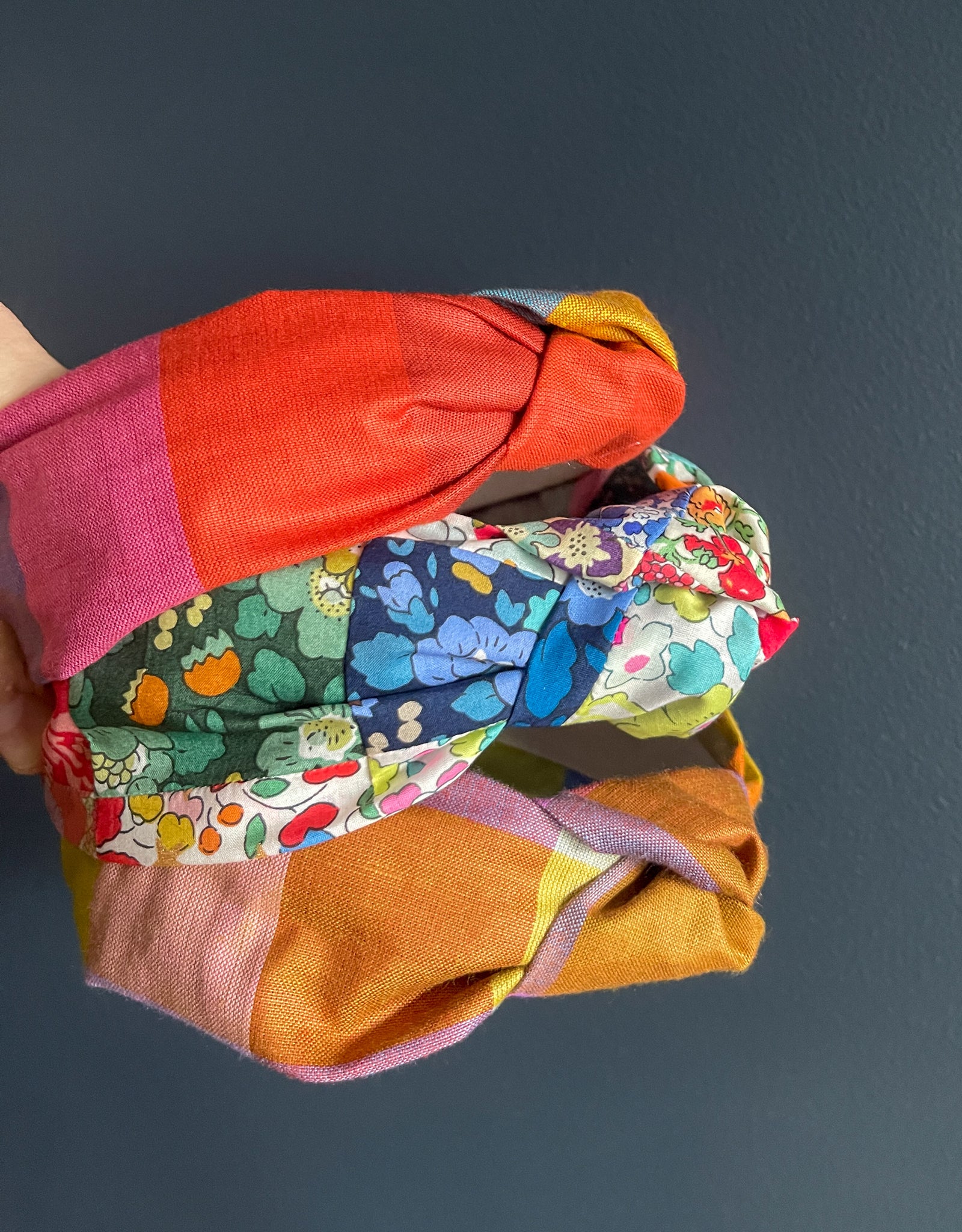 Topknot headband made using Poolside Stripe in Peony warp and weft fabric designed by Alexia Marcelle Abegg for Ruby Star Society.
